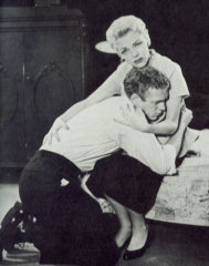 | A Hatful of Rain was already a big success on Broadway when Steve joined the cast. It was his Broadway debut. The play's topic was drug addiction, and Steve played the role of addict Johnny Pope. Steve appeared opposite actress Vivian Blain (who played his wife). His performance was good, but never a complete success, which some put down to the fact that Blain looked old enough to be his mother. Kim Hunter took over Blain's role when she left the cast, but the same age issue remained. This element did not play well with the critics. | |||